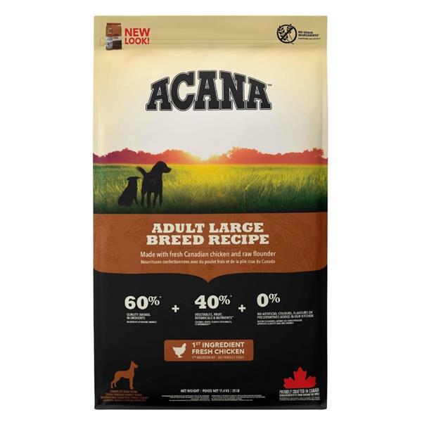 Doğal beslenme koşullarına eşdeğer bir düzeyde olabilmesi için protein açısından daha zengin ve daha düşük oranda karbonhidrat içeren ACANA ADULT LARGE BREED, içeriğinin yüzde 60'ının tamamen yerel kaynaklardan elde edilen üst düzeyde et ürünlerinden - kümes veya fabrikalarda değil, doğal koşullarda yetişmiş tavuk, yerel çiftliklerimizden elde ettiğimiz bütün yumurta, Vancouver Adasından gelen dil balığı – kendi bölgemizden GÜNLÜK ve TAZE temin edilmekte olan ve hiç bir şekilde dondurulmamış, koruyucu katkı maddeleri ilave edilmemiş malzemeler ile dopdoludur.