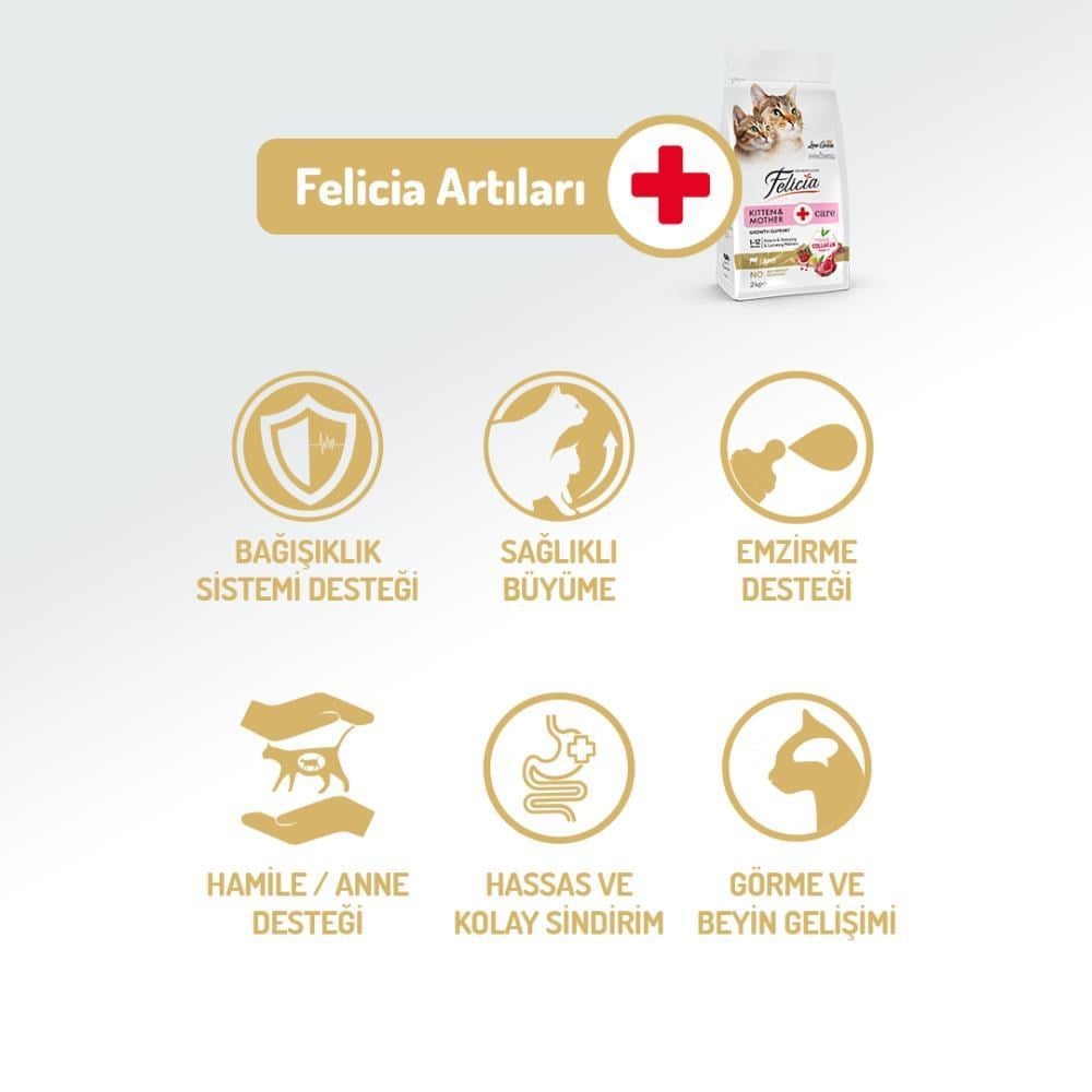 Felicia® Kitten & Mother Care Lamb, yeni doğan yavrular, anneleriyle birlikte büyüyen kediler veya operasyon sonrası toparlanma sürecinde olan kediler için özel olarak geliştirilmiştir. Gerçek kuzu eti proteini, kolajen desteği ve süper besinlerle zenginleştirilmiş formülü sayesinde anne ve yavru kedilerin tüm gelişim evrelerinde eksiksiz beslenme desteği sunar.