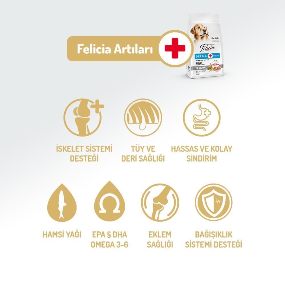Felicia® olarak, orta ve büyük ırk yetişkin köpeklerin hassas ihtiyaçlarını ve gıdaya bağlı potansiyel hassasiyet risklerini hedefleyen yenilikçi çözümler sunuyoruz. Felicia® Derma Care Adult Salmon, kolajen desteği ve özenle seçilmiş süper besinlerle zenginleştirilmiş yeni nesil formülüyle, gıdaya bağlı hassasiyet riskini minimuma indirirken, dostunuza kapsamlı bir bakım sunar. Norveç somonundan gelen yüksek kaliteli protein, sadece üstün sindirilebilirlik sağlamakla kalmaz; aynı zamanda güçlü bir bağışıklık sistemi ile sağlıklı deri ve parlak tüy yapısının gelişimini aktif olarak destekler.