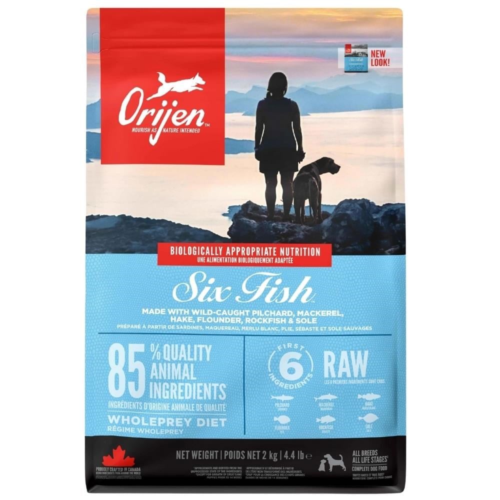 Köpeklerin doğal yaşamdaki beslenmelerini örnek alınarak geliştirilen Orijen 6 Fish köpeklere doğal beslenme sunmayı amaçlar, bu doğrultuda oluşturulan içeriği yüksek protein ve düşük miktarda karbonhidrat içerir. Pasifik sardalyası, barlam balığı, uskumru, pisi balığı, kaya balığı ve dil balığından hazırlanmıştır. Tamamen taze ve hiç bir koruma maddesi içermez.